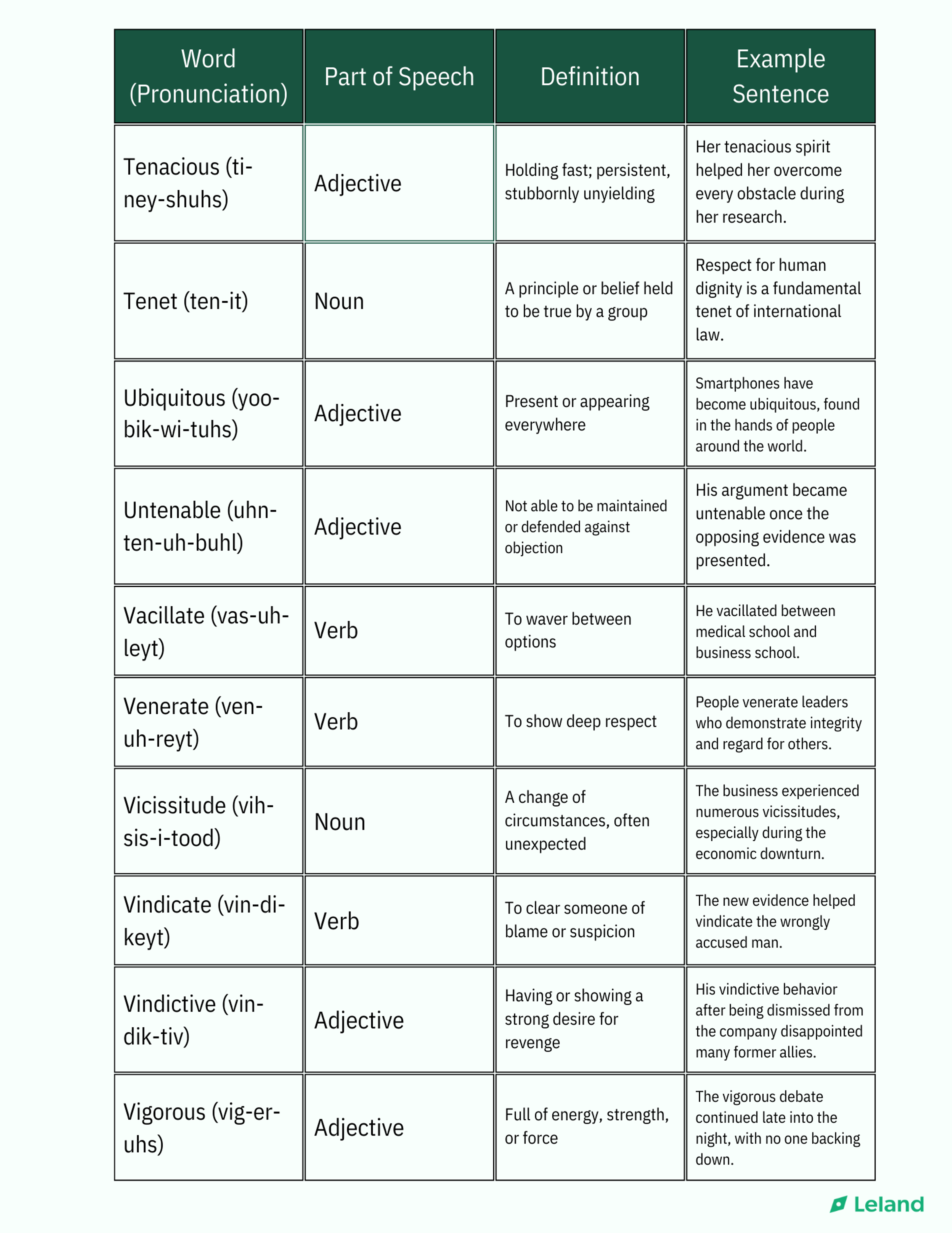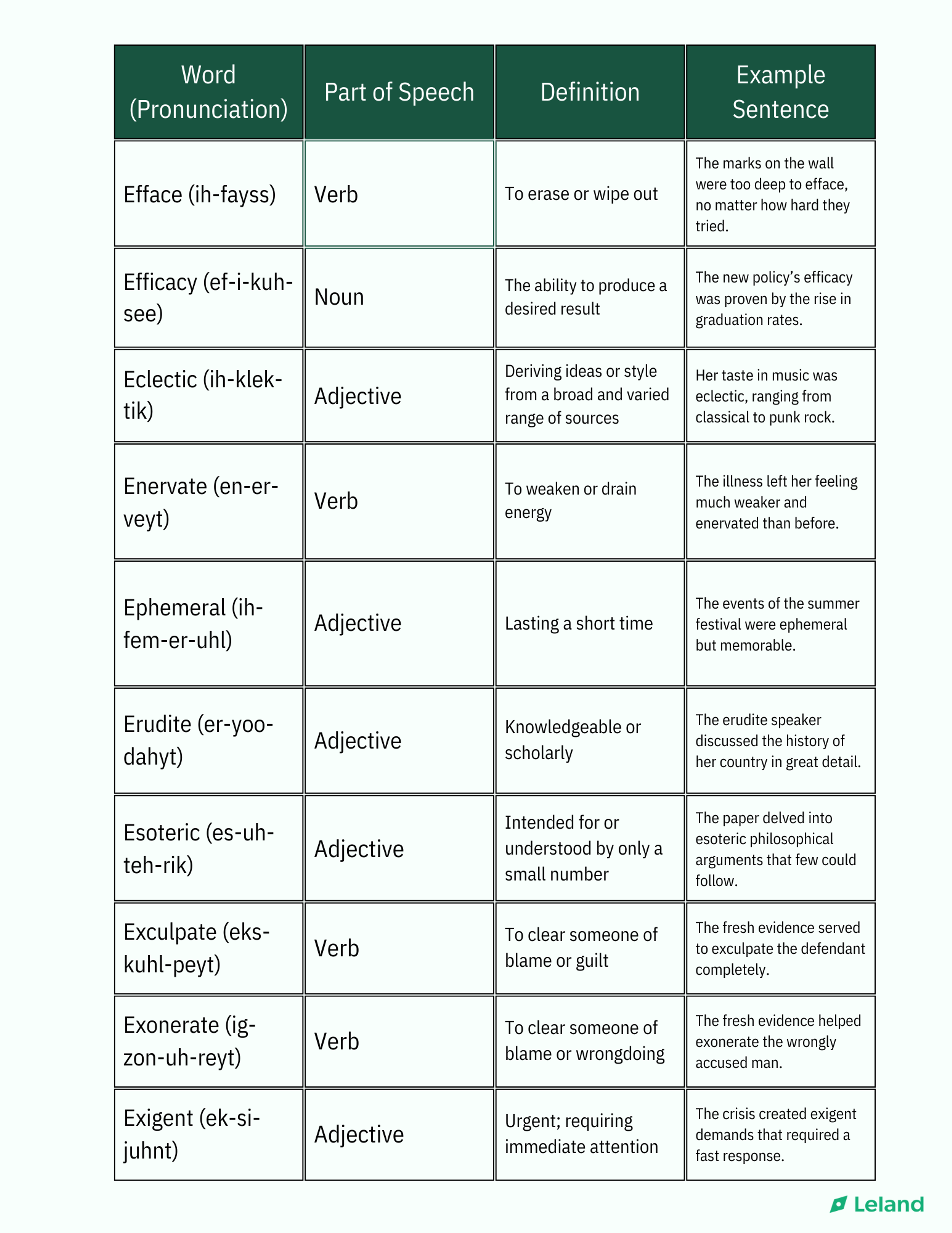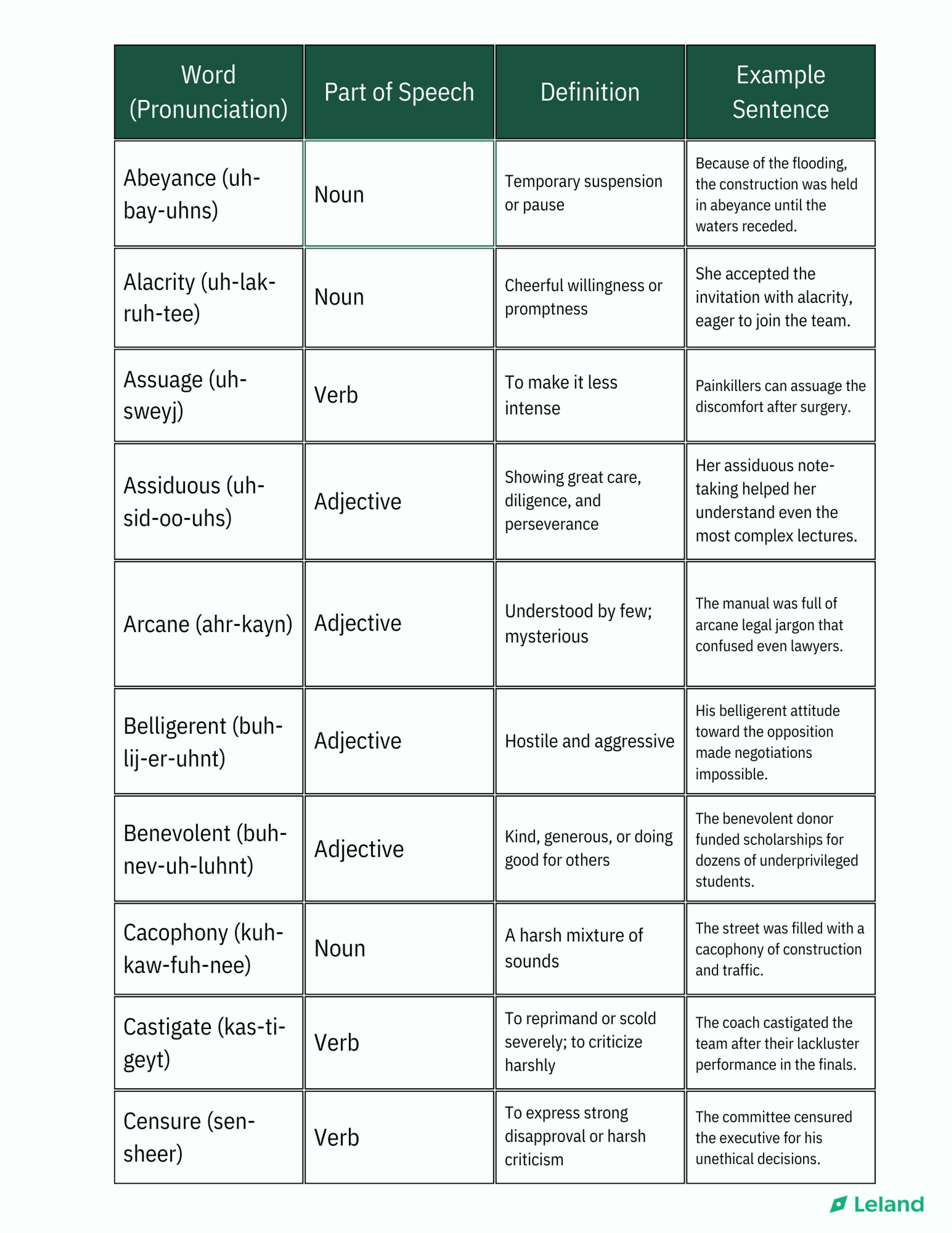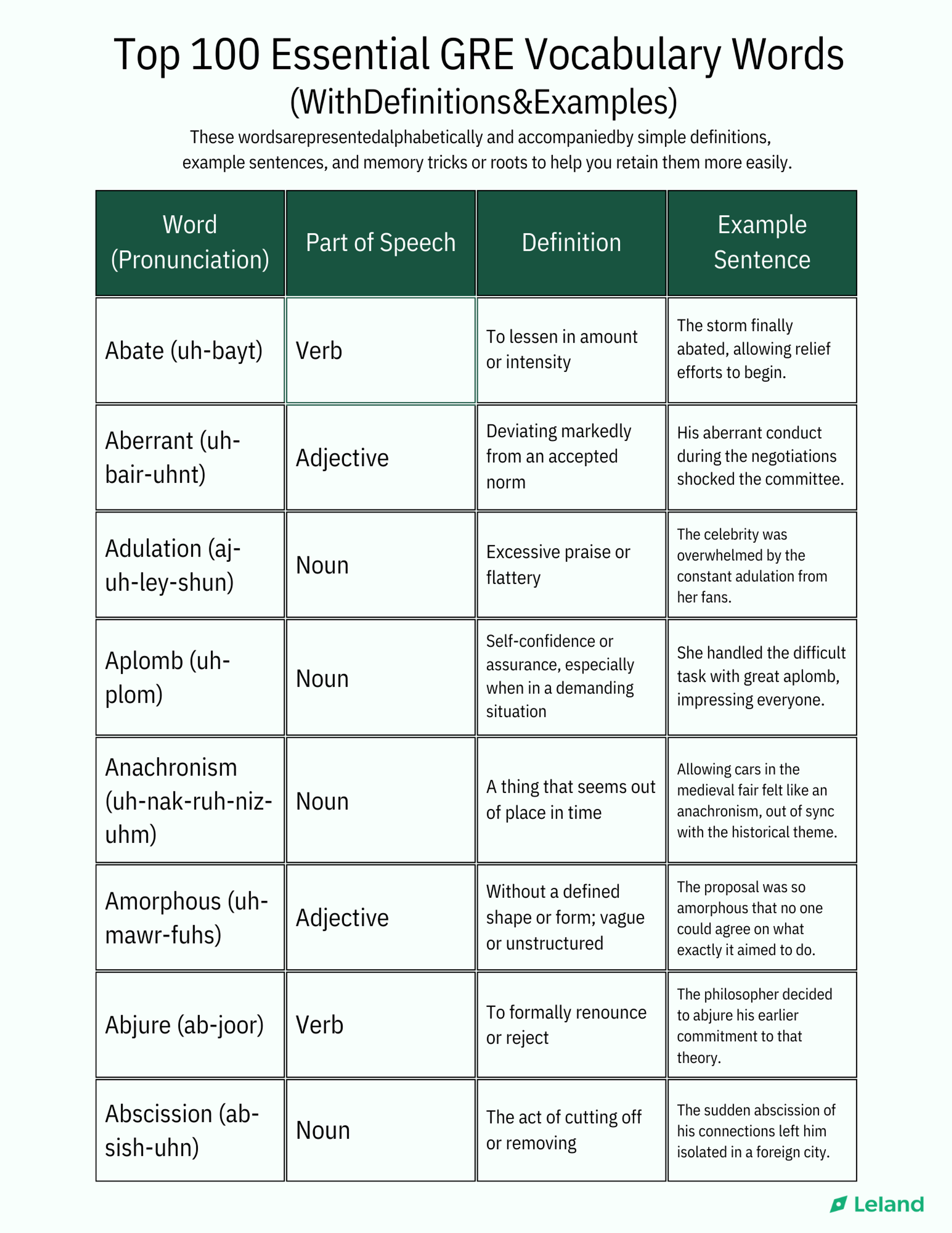 If you’re seeking more personalized guidance to help you prepare for the GRE, reach out to our GRE experts. Learning words is easier when you have expert support. A GRE coach can: Build a custom study schedule based on your target score and availability, help you decide which areas to focus on, and keep your practice consistent and on track. You’ll get guidance from someone who understands the test and how to improve scores quickly. Find a GRE coach on Leland to start making consistent progress.
