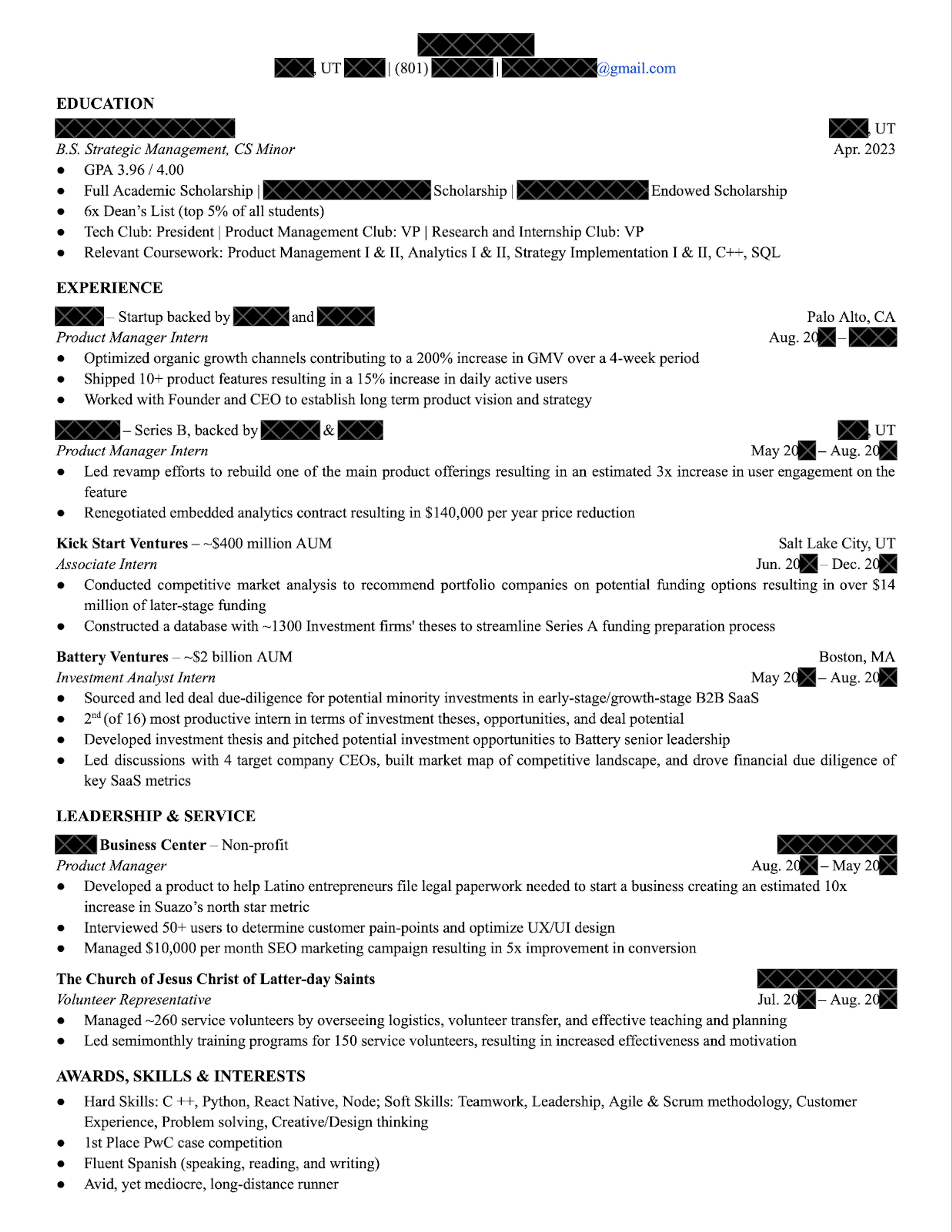 To help you craft an impressive associate product manager resume, let's look at a real-world example that showcases effective strategies for standing out among the competition. This example highlights best practices for presenting your skills and achievements in product management, and is a real resume that an APM used to recruit and receive offers at several top tech companies.