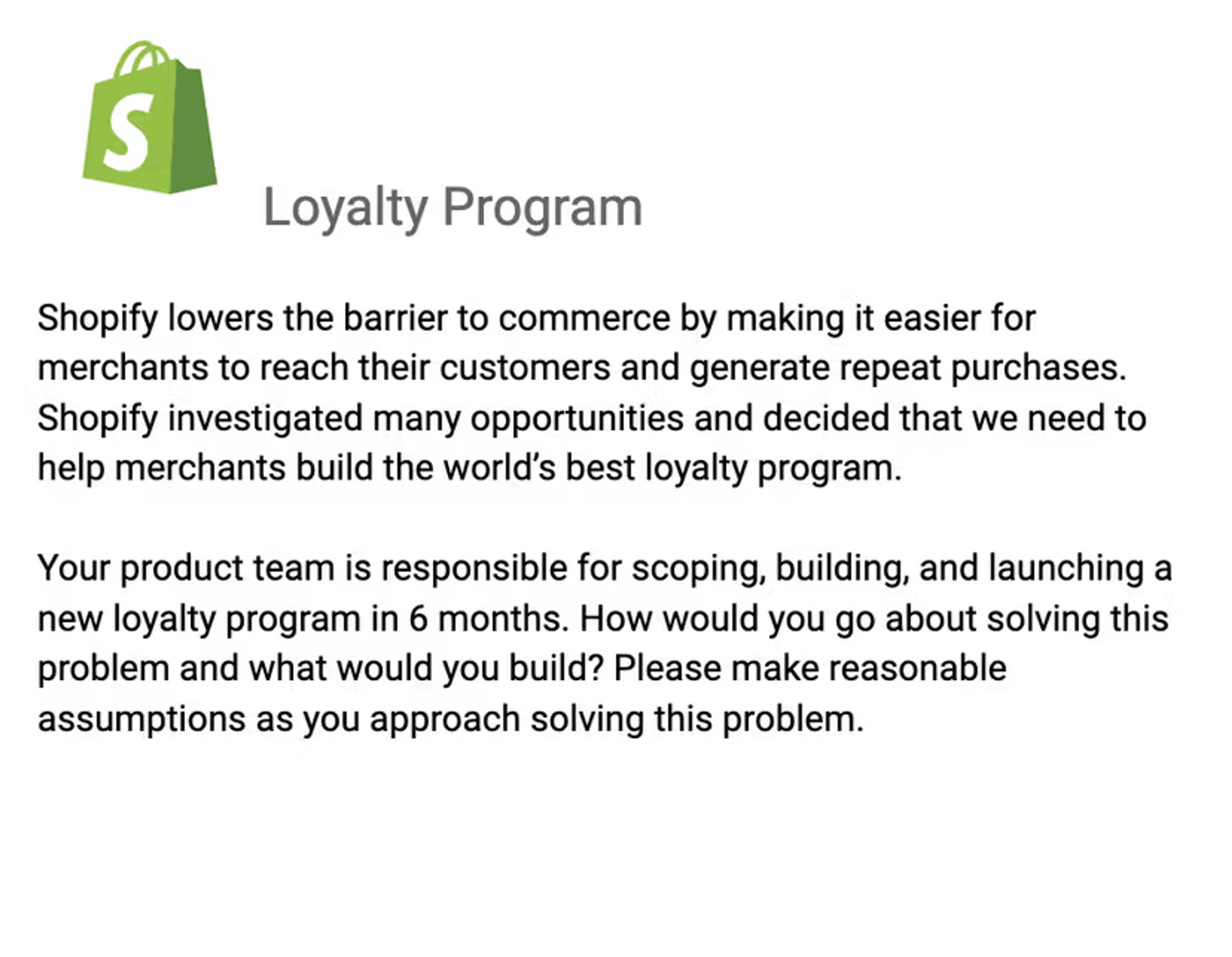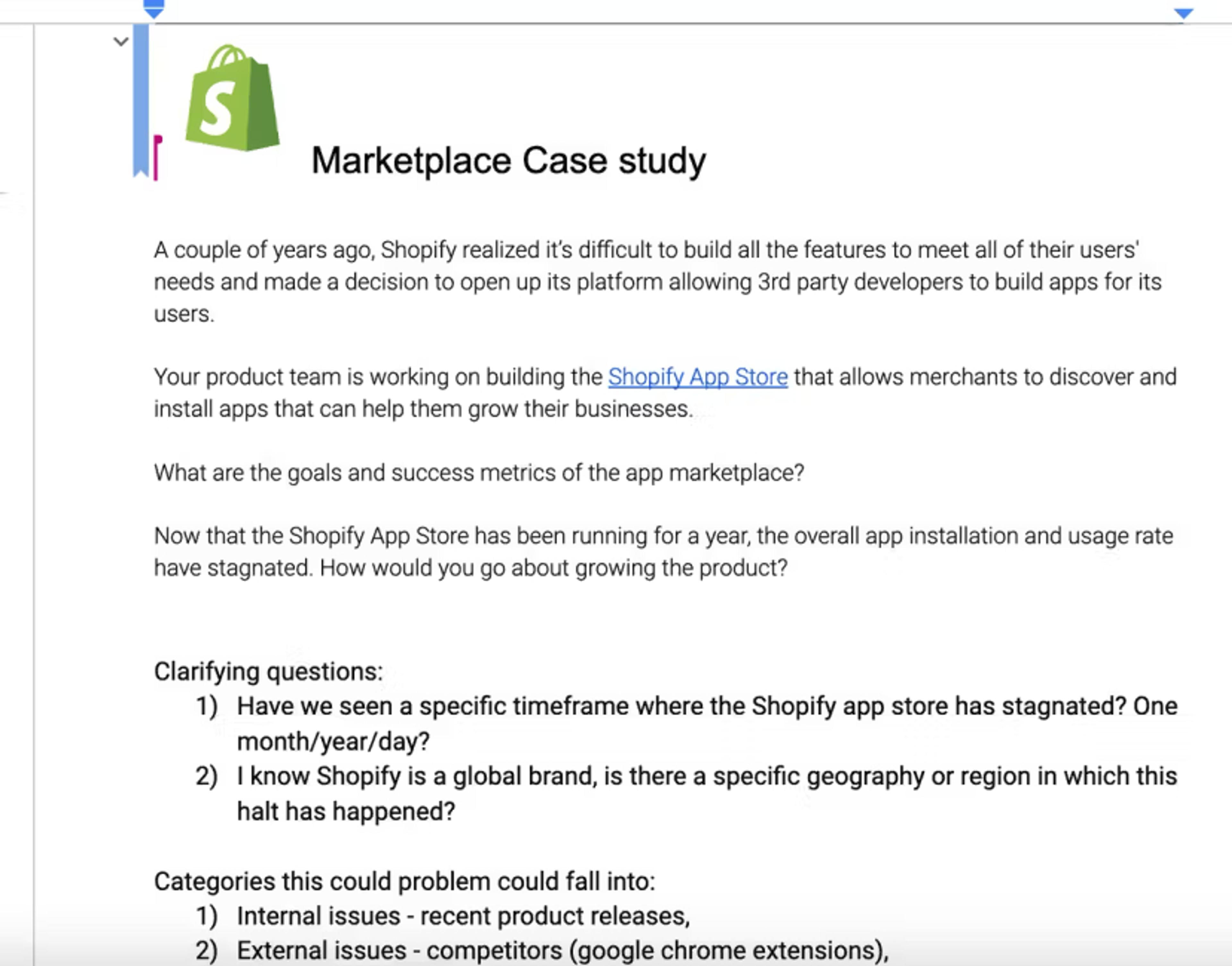 Notice the pattern? Shopify doesn’t use case prompts with tons of constraints or numbers. They’re looking for structured thinking, not math. Your job is to ask thoughtful, clarifying questions, scope the problem, surface assumptions, and walk the interviewer through your reasoning, not to “solve” the case like a consulting interview.