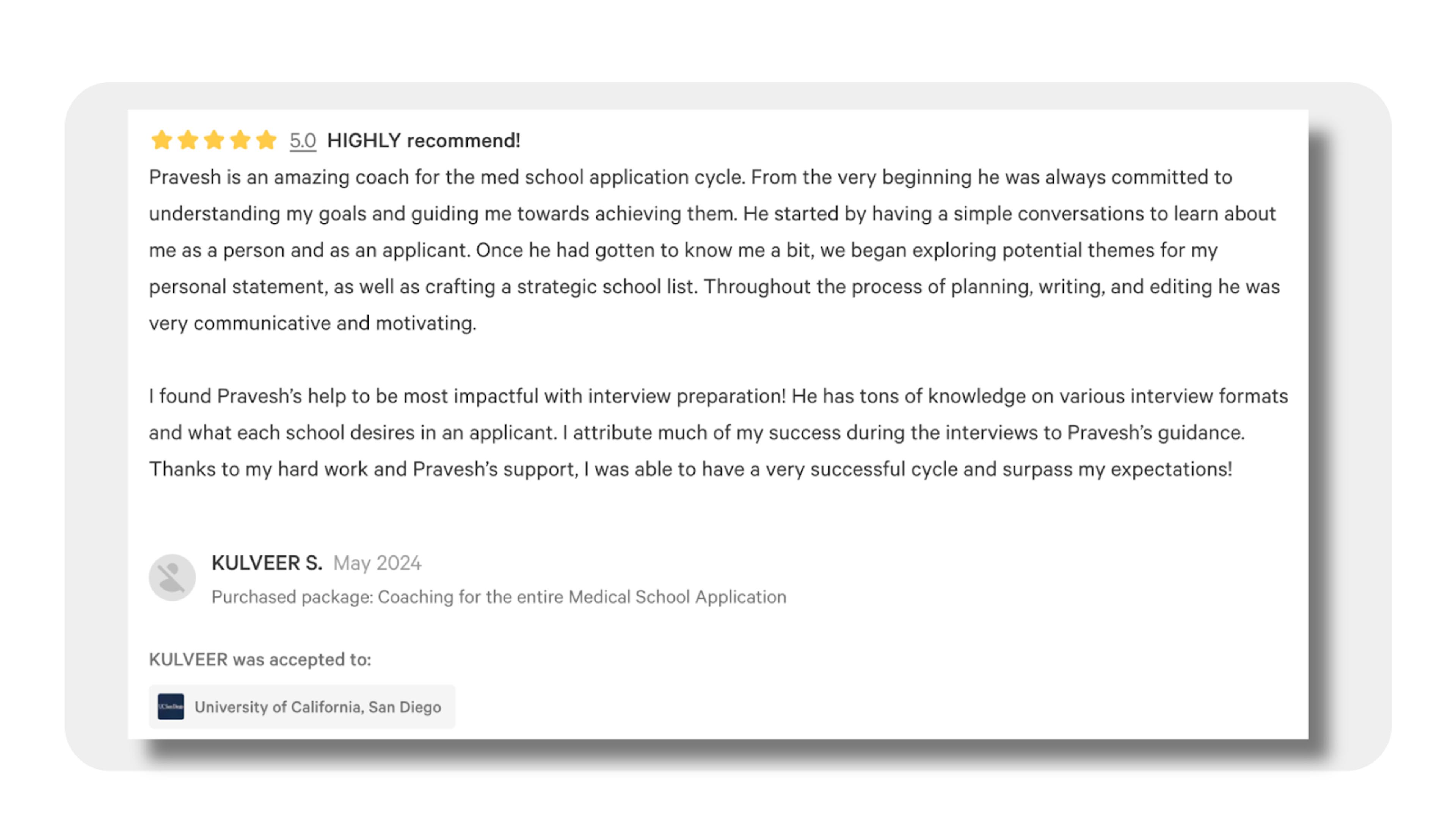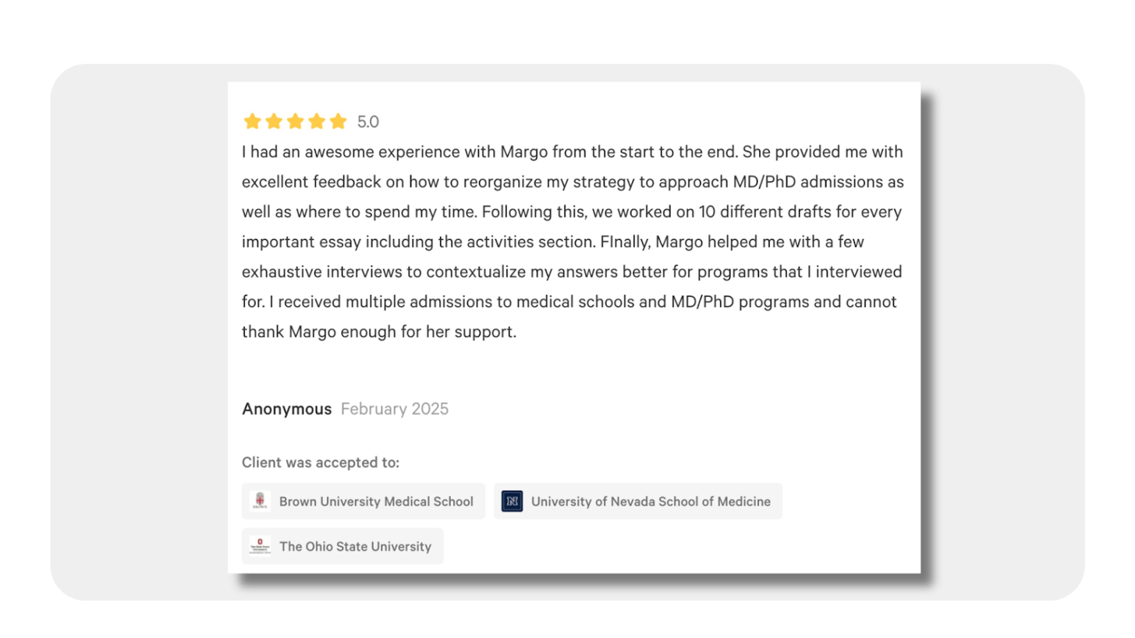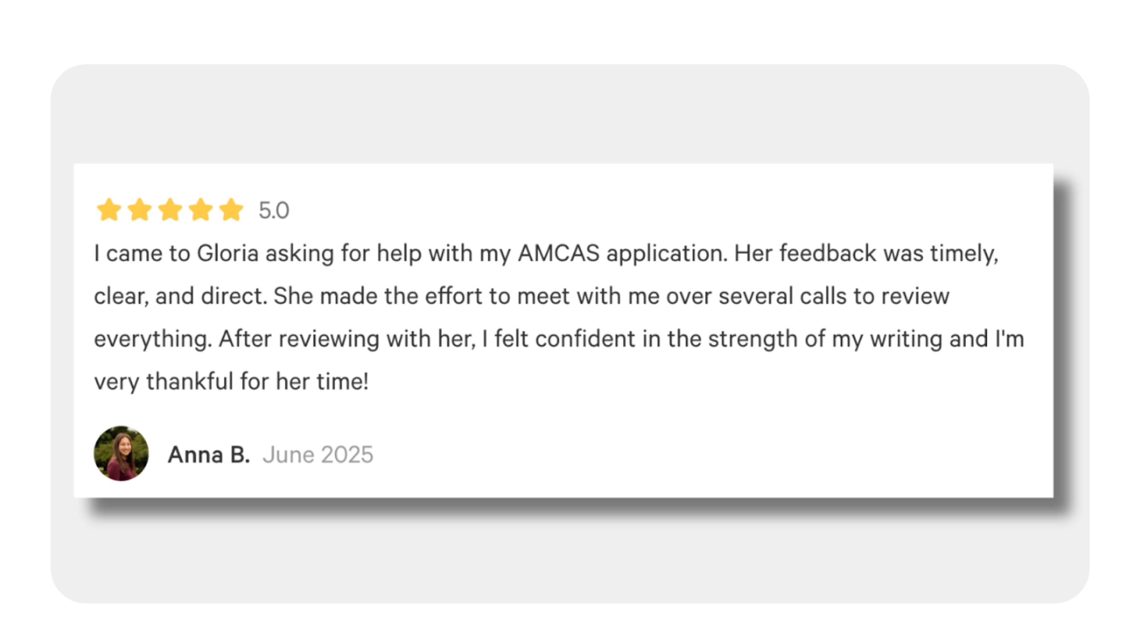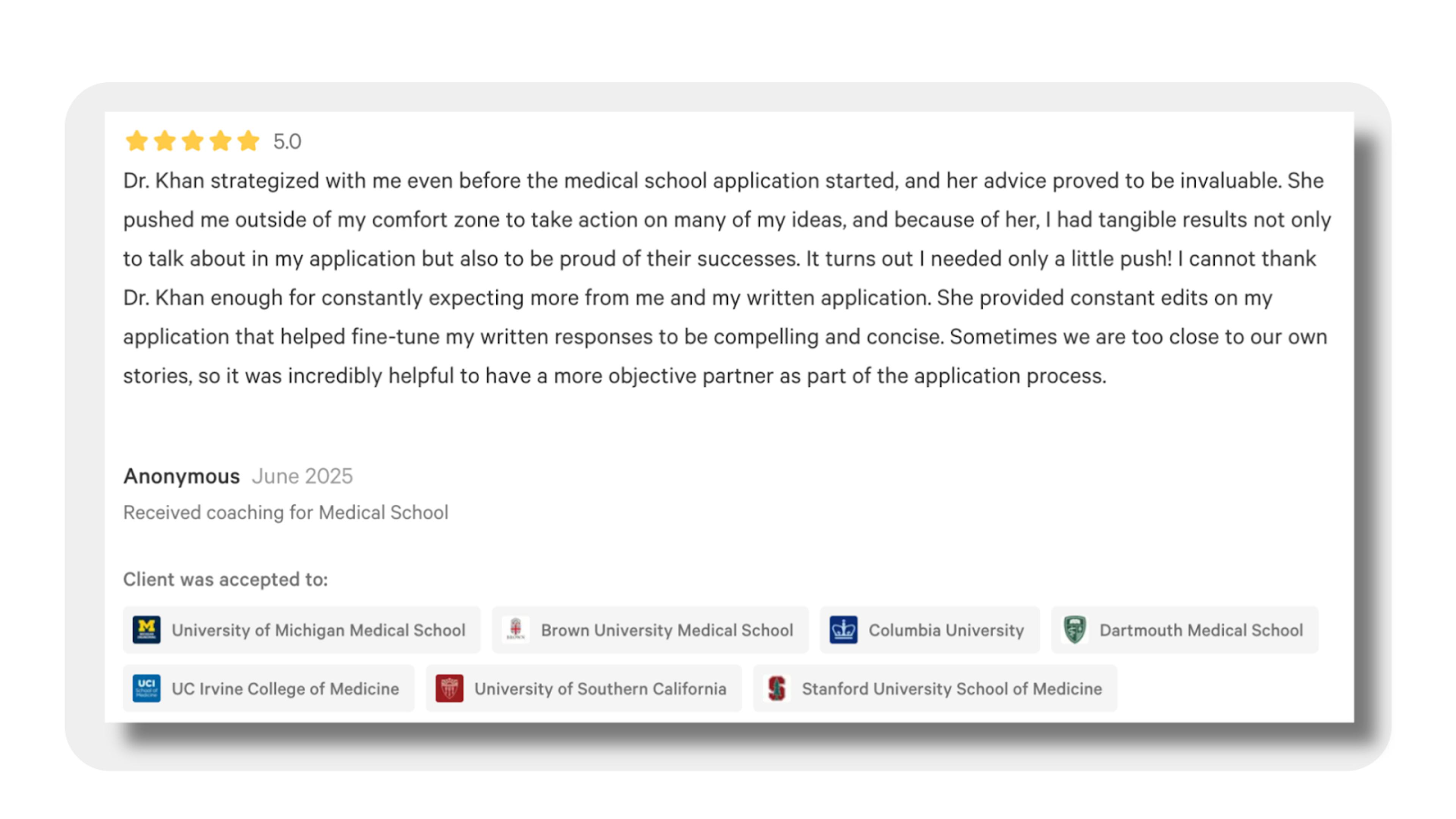 Whether you’re a first-time applicant, a reapplicant, an international student, or coming from an nontraditional path, these coaches offer services that go far beyond essay editing: they help you build a personalized plan for success. From MCAT preparation and extracurricular activities to school selection and interview strategy, they’ll guide you through the entire process and ensure your story stands out in the best light. Here’s what a few recent applicants have said about working with a coach: