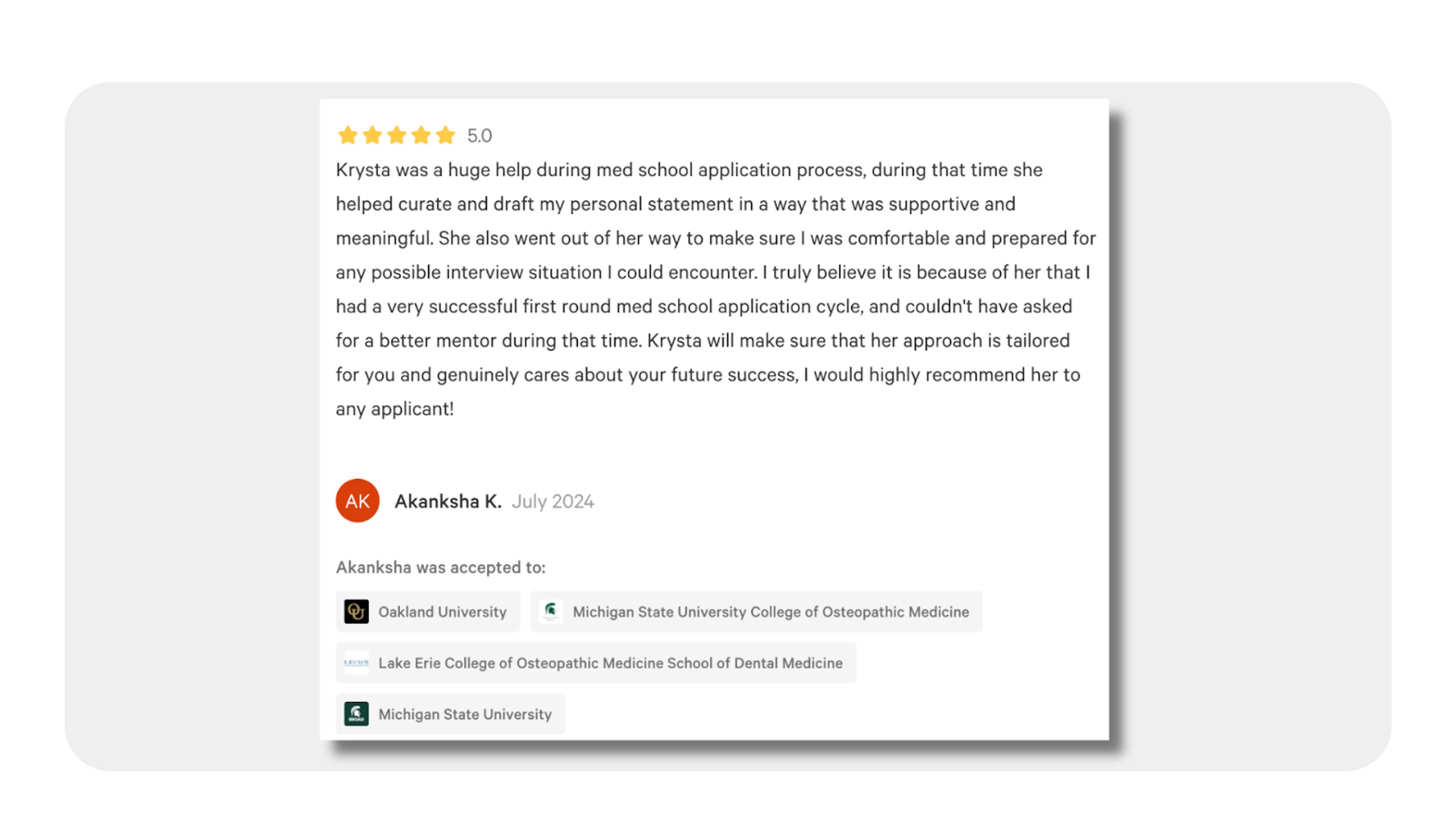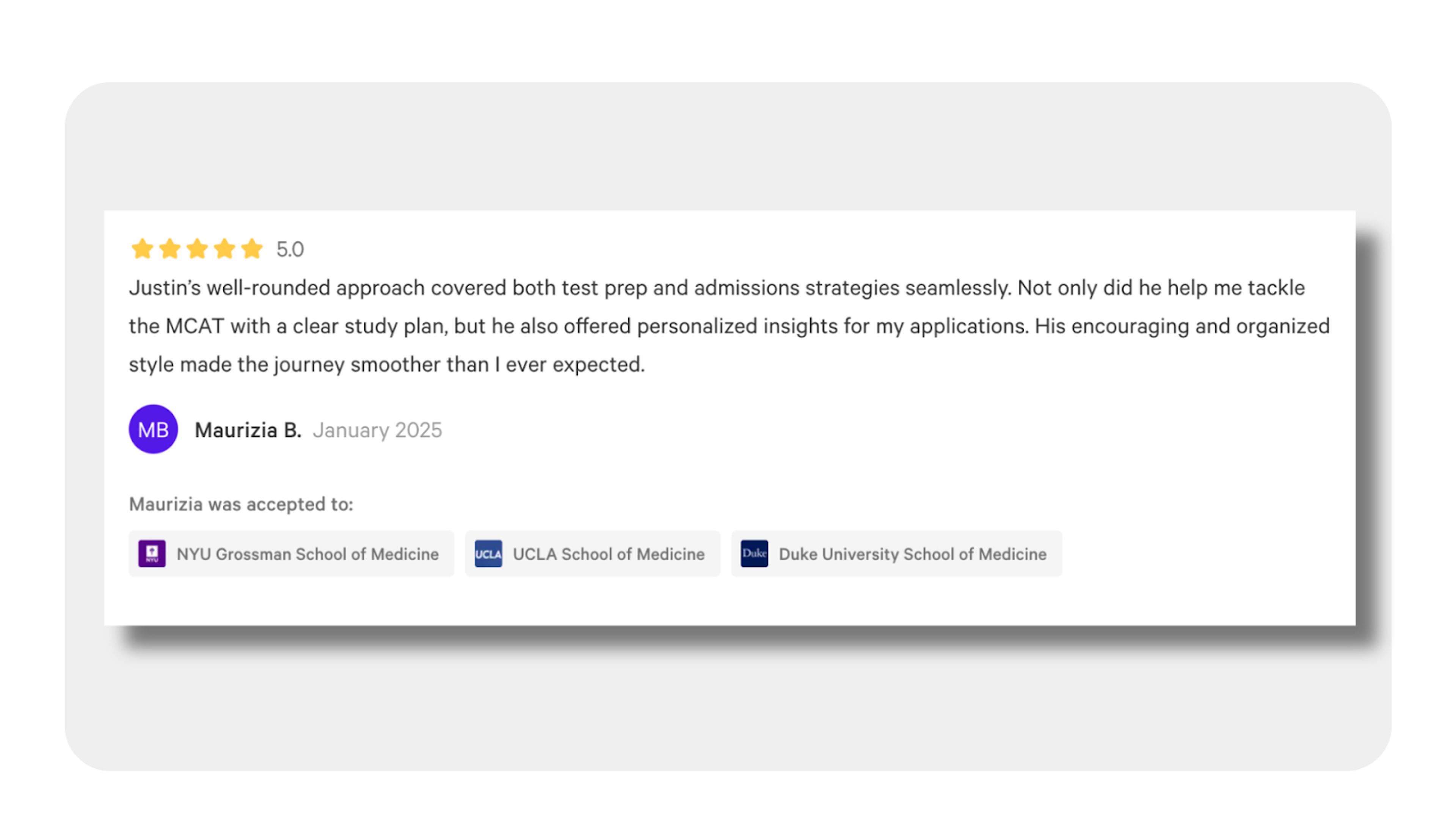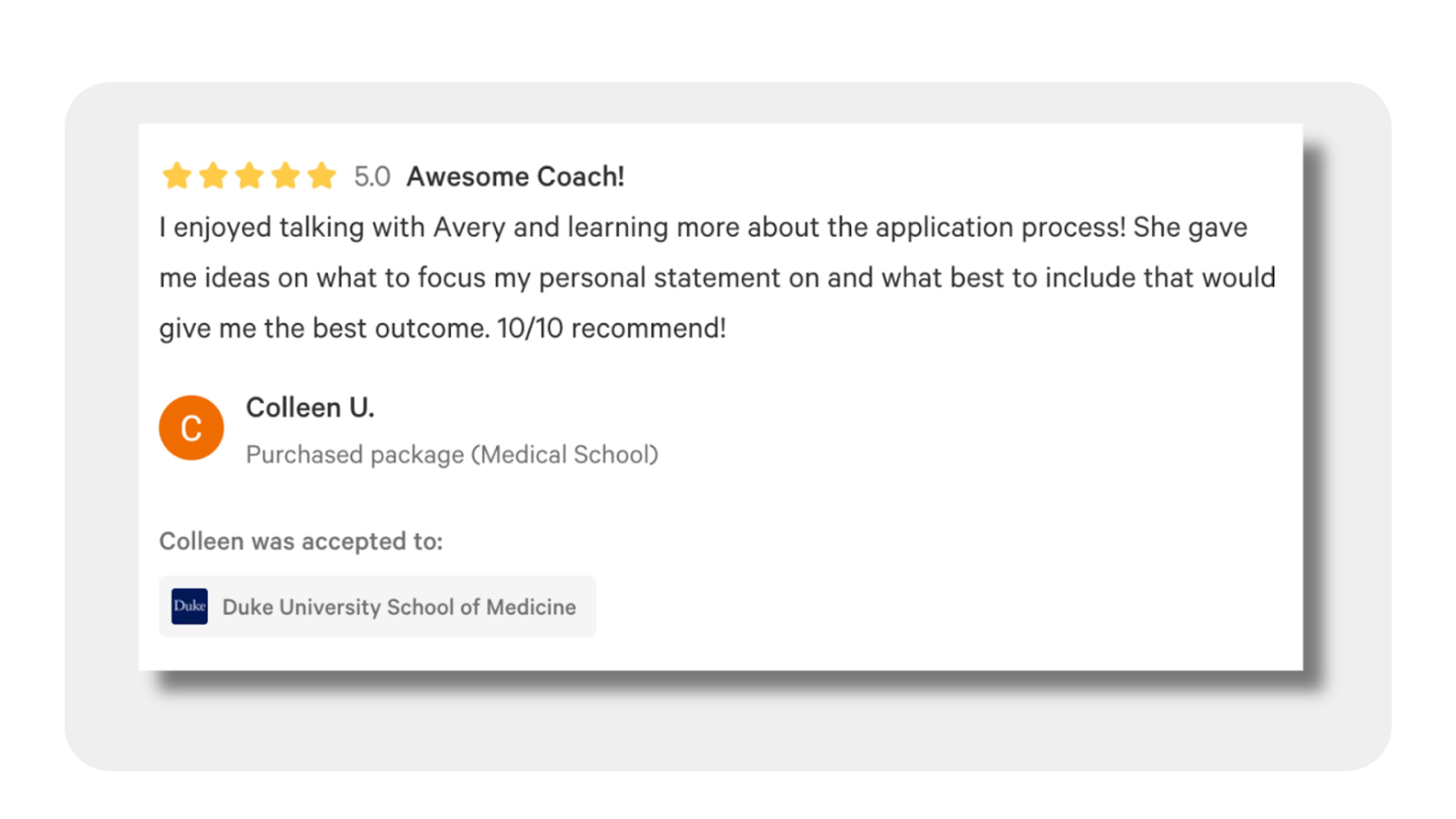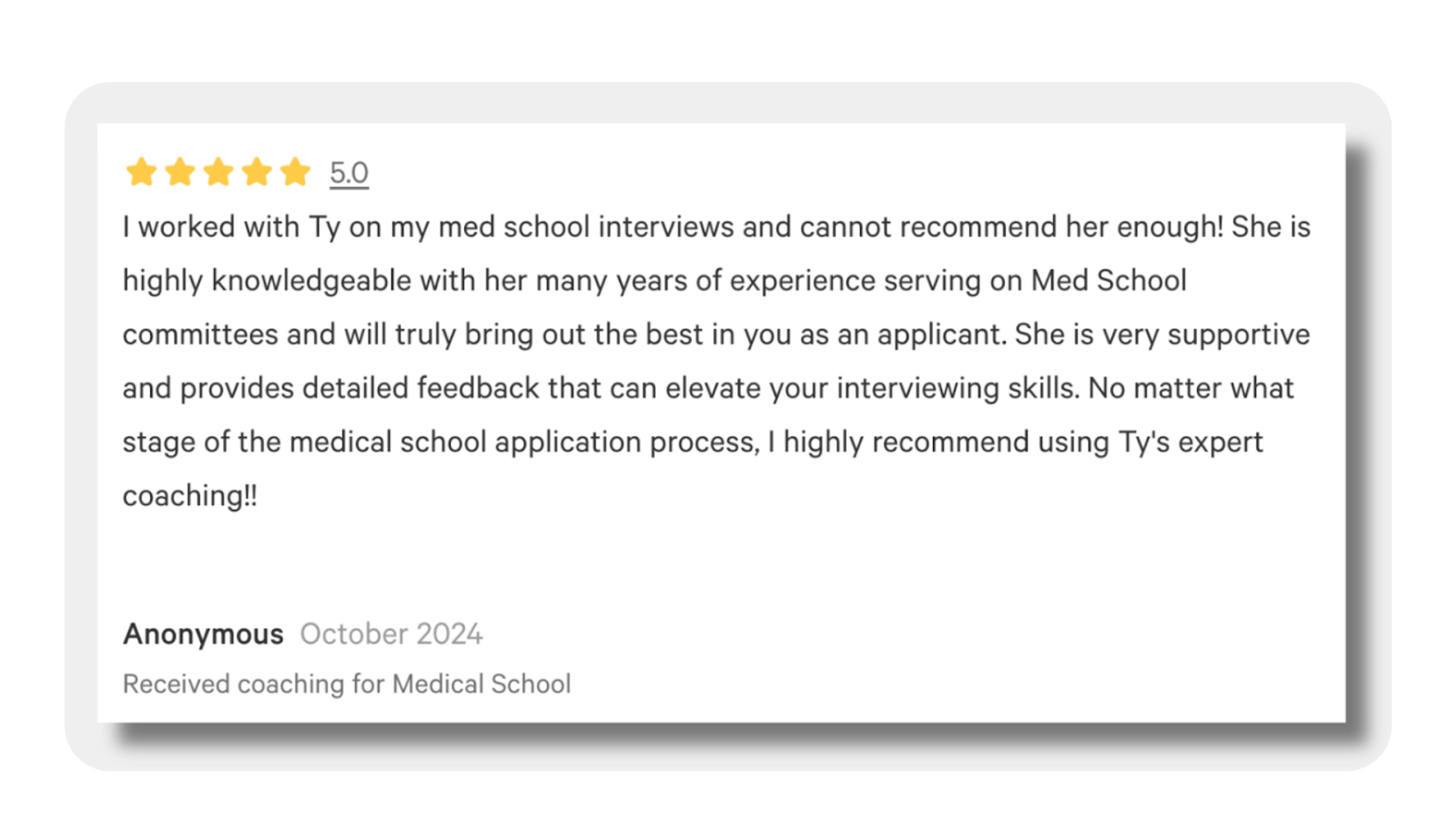 Whether you’re a first-time applicant, a reapplicant, an international student, or coming from an nontraditional path, these coaches offer services that go far beyond essay editing: they help you build a personalized plan for success. From MCAT preparation and extracurricular activities to school selection and interview strategy, they’ll guide you through the entire process and ensure your story stands out in the best light. Here’s what a few recent applicants have said about working with a coach: