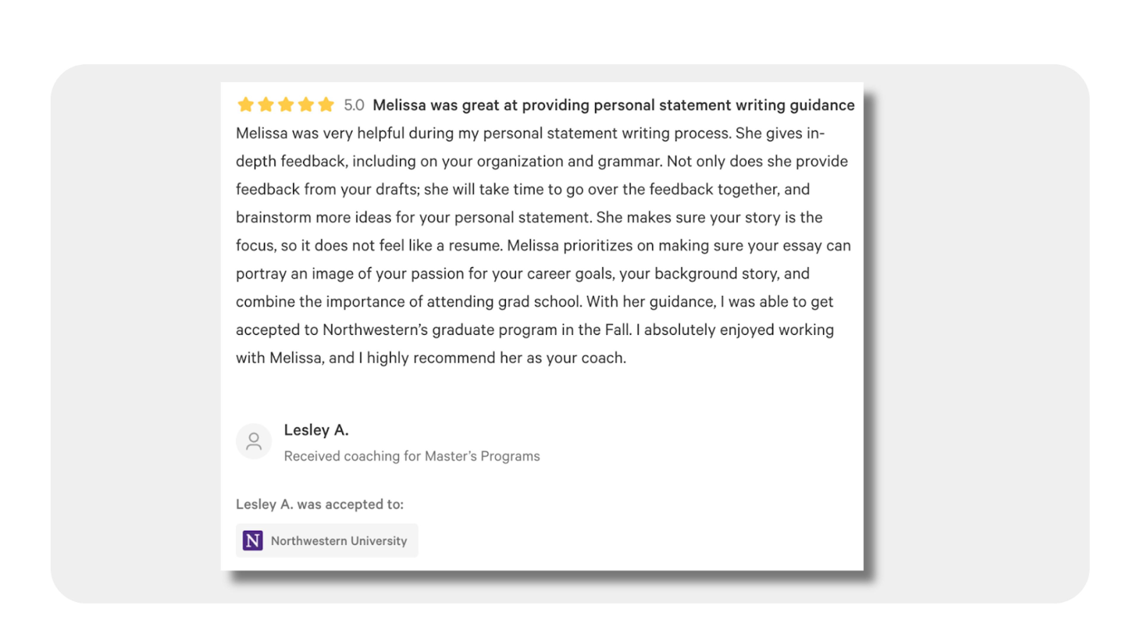 Melissa M. | ⭐⭐⭐⭐⭐ | 50+ | Harvard, Northwestern, DePaul, Cornell, UCSD, University of Virginia, Boston University, Indiana University + more |