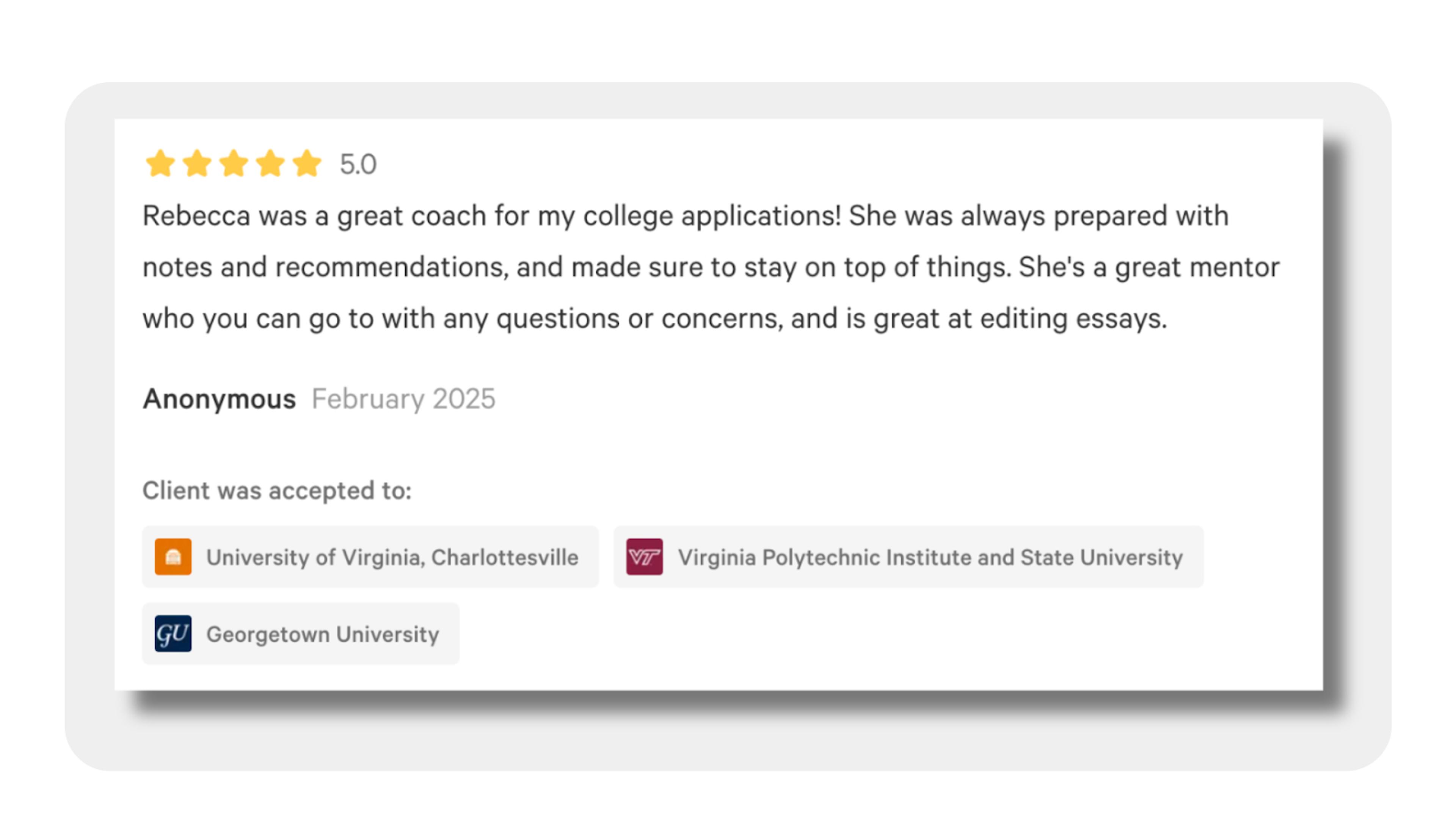 Rebecca L. | ⭐⭐⭐⭐⭐ | 300+ | University of Virginia, Georgetown, Virginia Polytechnic Institute |