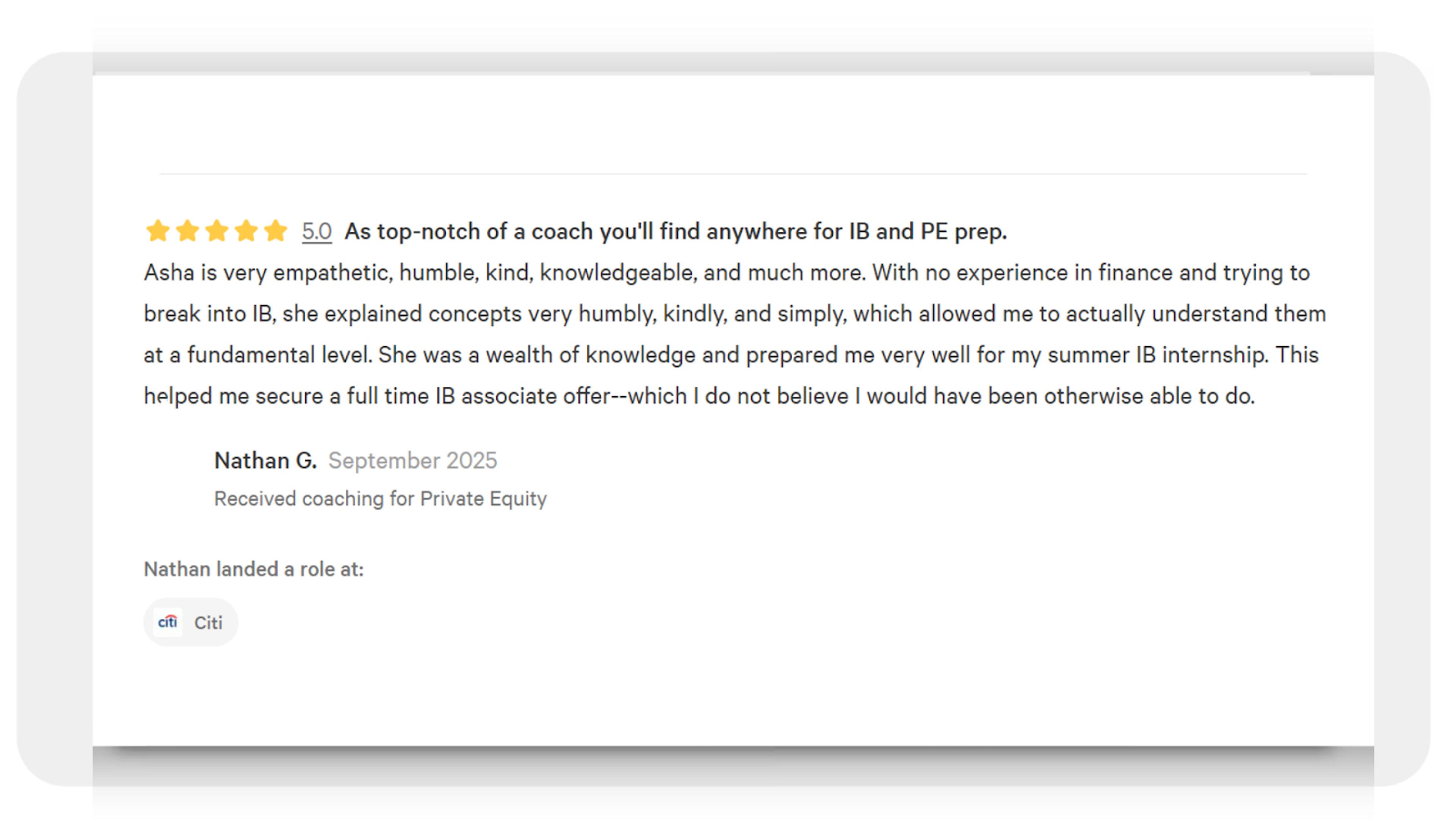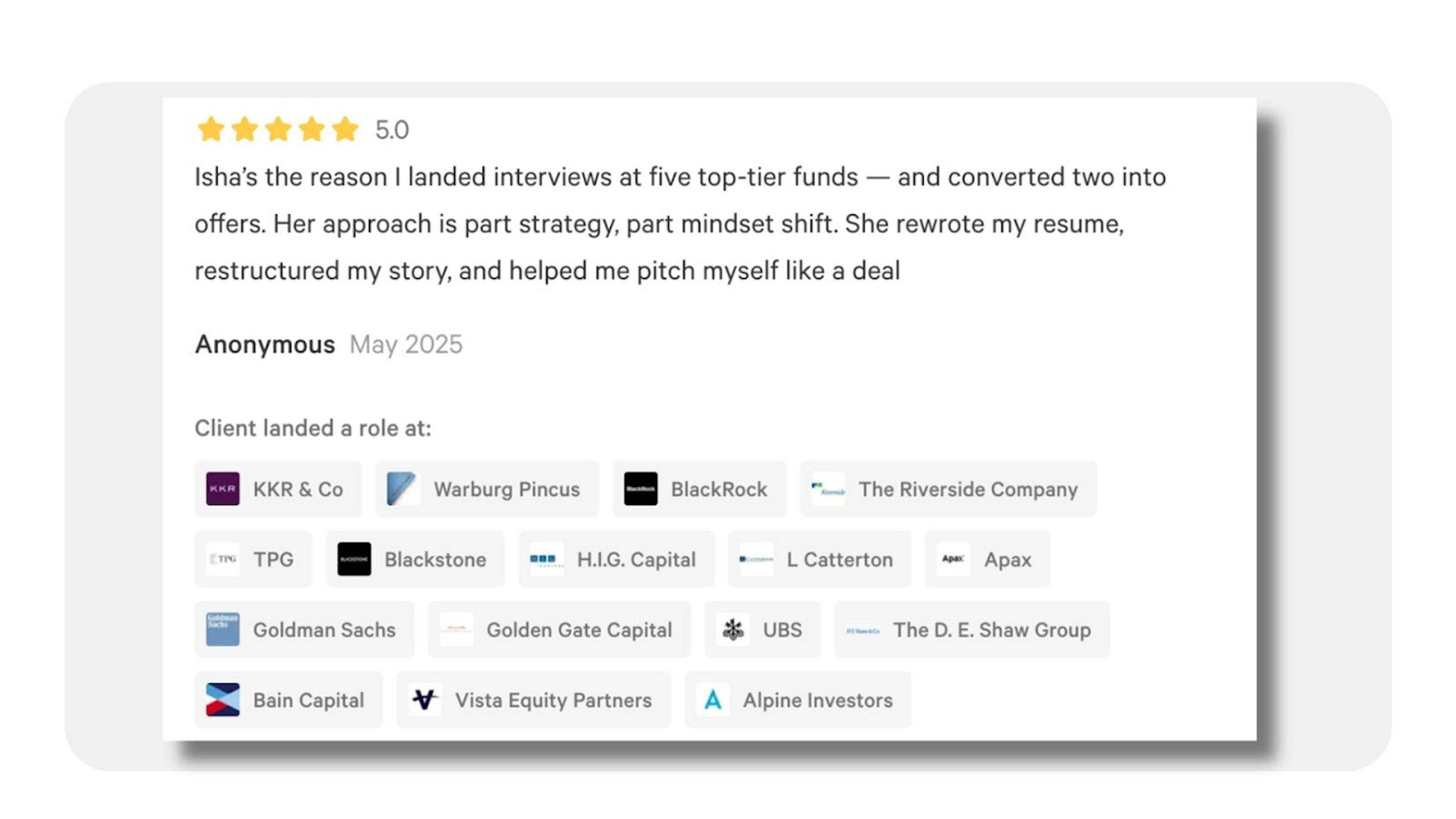 | Asha T. | ⭐⭐⭐⭐⭐ | 200+ | 9.9 | KKR, Bain Capital, TPG, Blackstone, Jefferies, The Carlyle Group, Morgan Stanley, SoftBank Vision Fund + more |