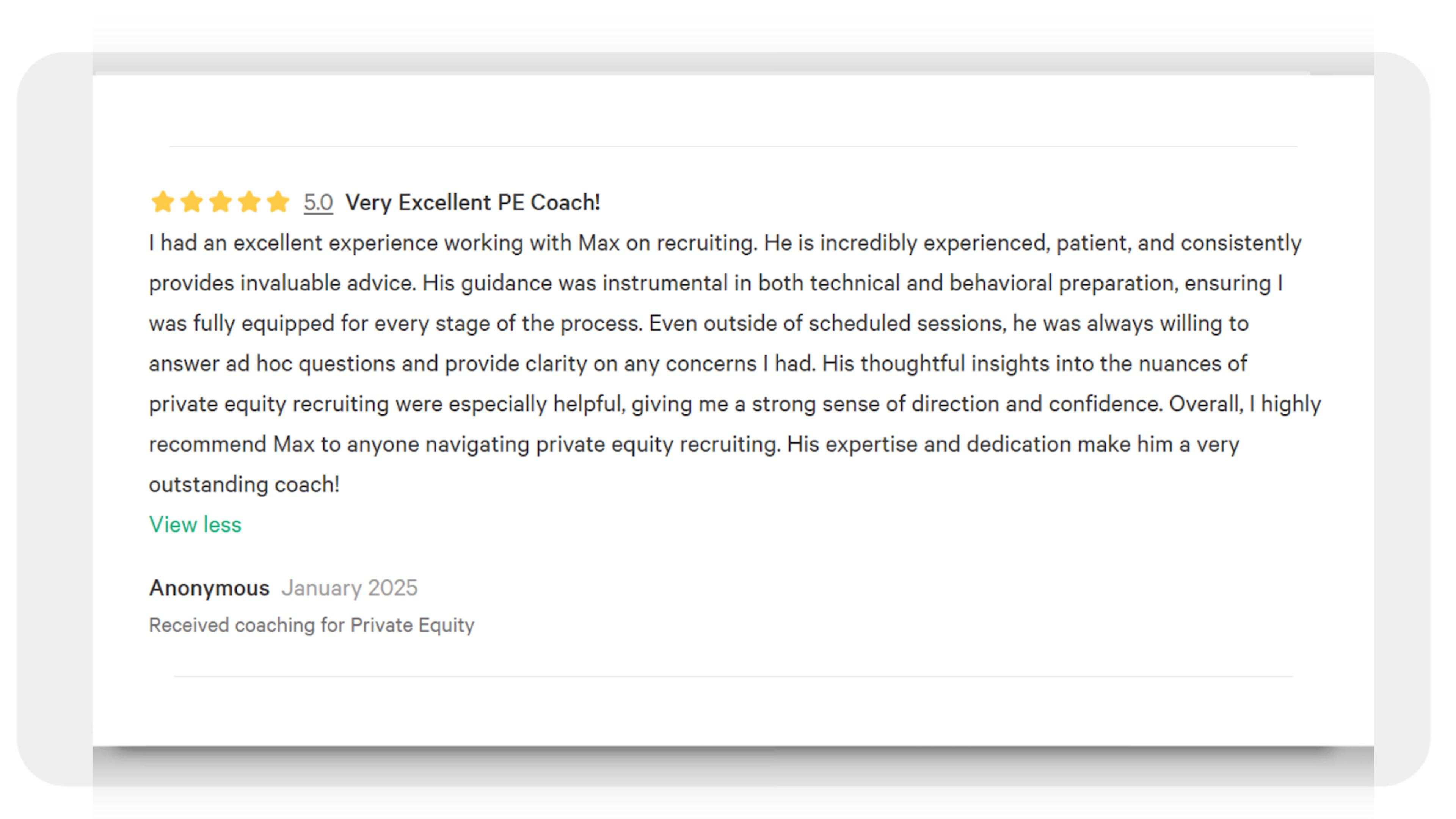 - Strategic Fit: The best coach will understand your background whether you're coming from a non-target school, consulting, or banking, and tailor their guidance accordingly. Great coaches know how to bridge your experience with the specific demands of PE recruiting.