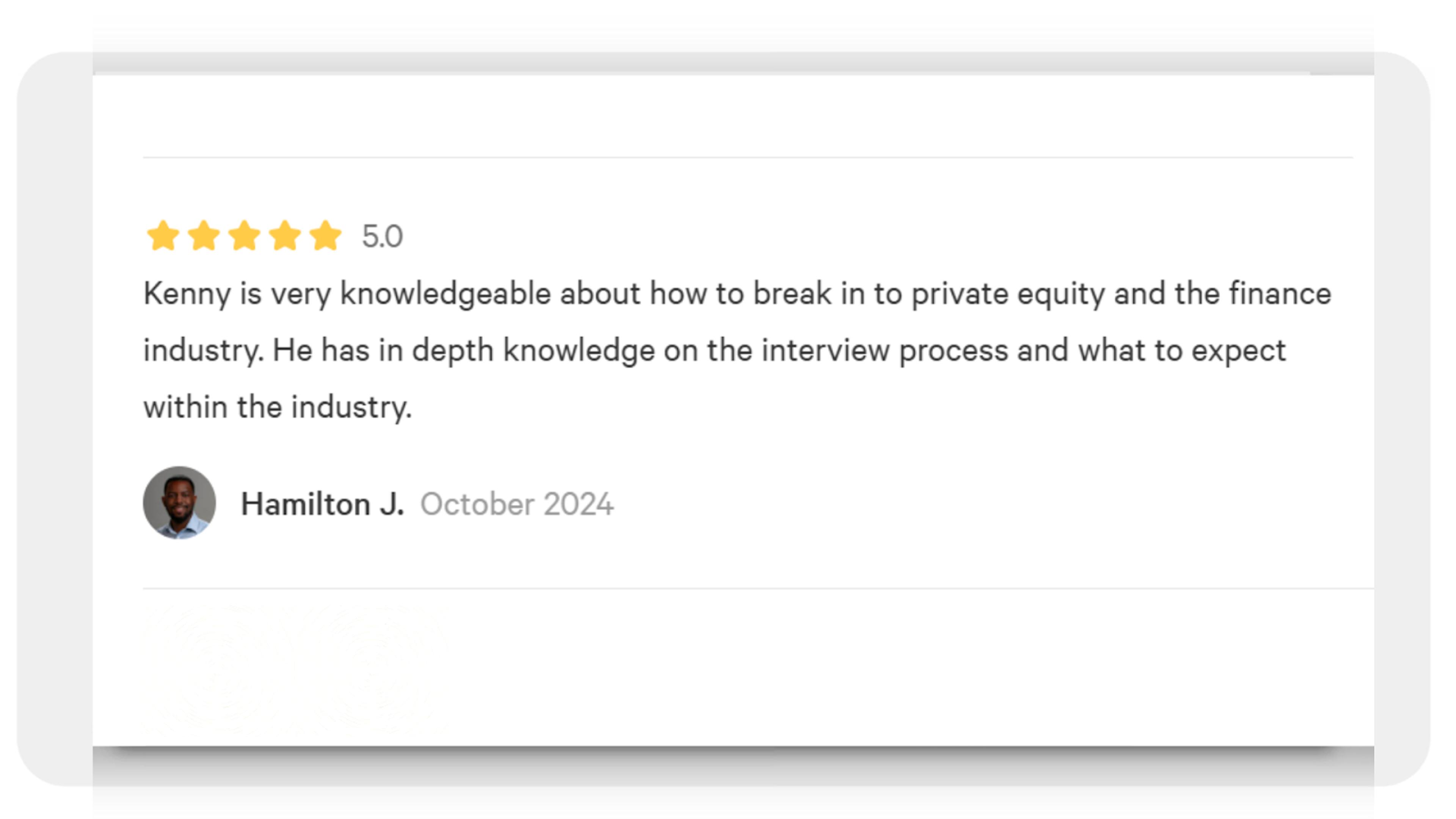 "I can’t recommend Kenny highly enough as a career coach and private equity professional. His deep industry knowledge and strategic insights were instrumental in helping me break into private equity and he has continued to be a resource as I navigate career decisions. Kenny’s personalized approach made a tremendous difference; he took the time to understand my goals and offered actionable advice that was both motivating and practical. Working with Kenny has been a game-changer and his mentorship has paid dividends for my career."