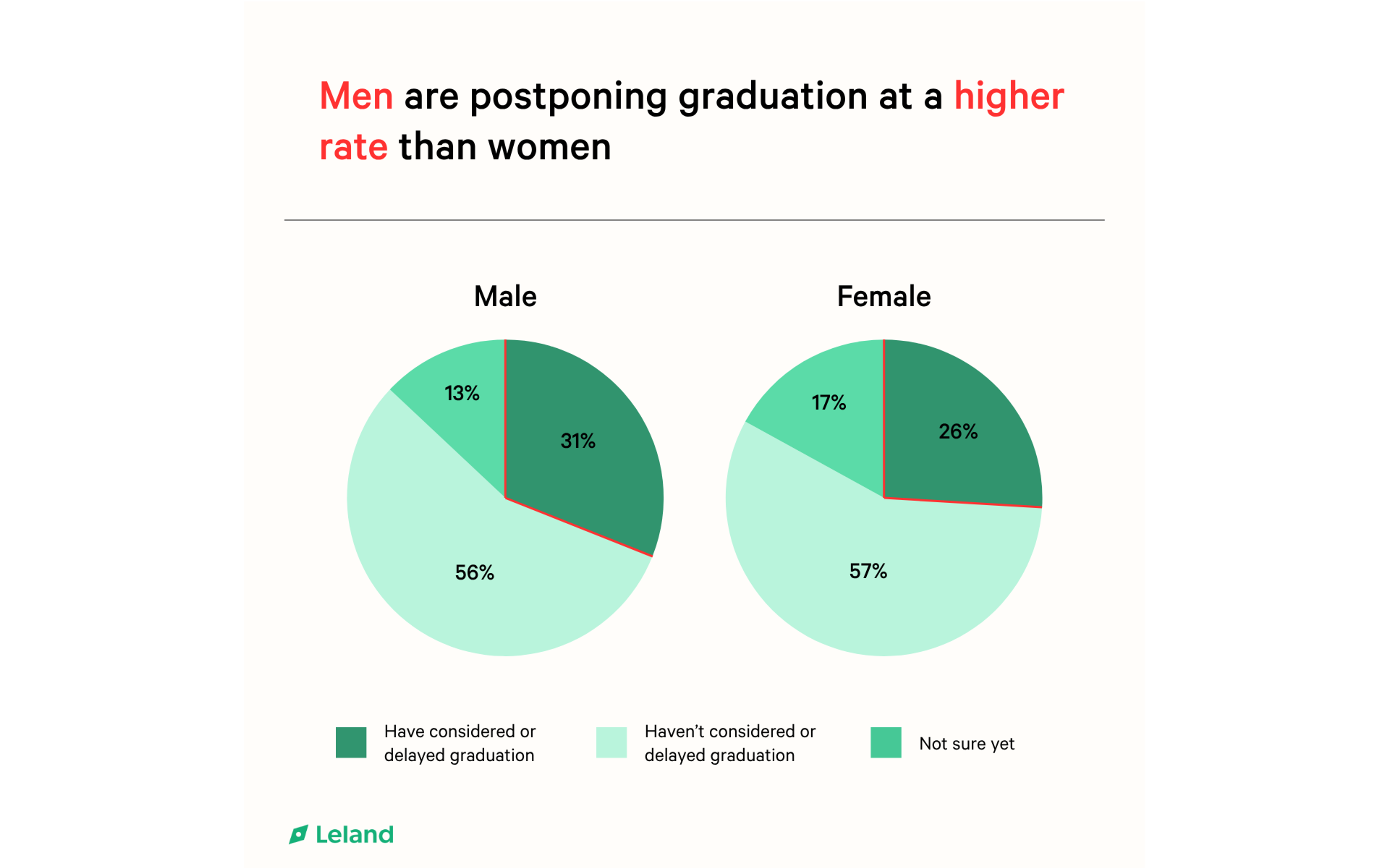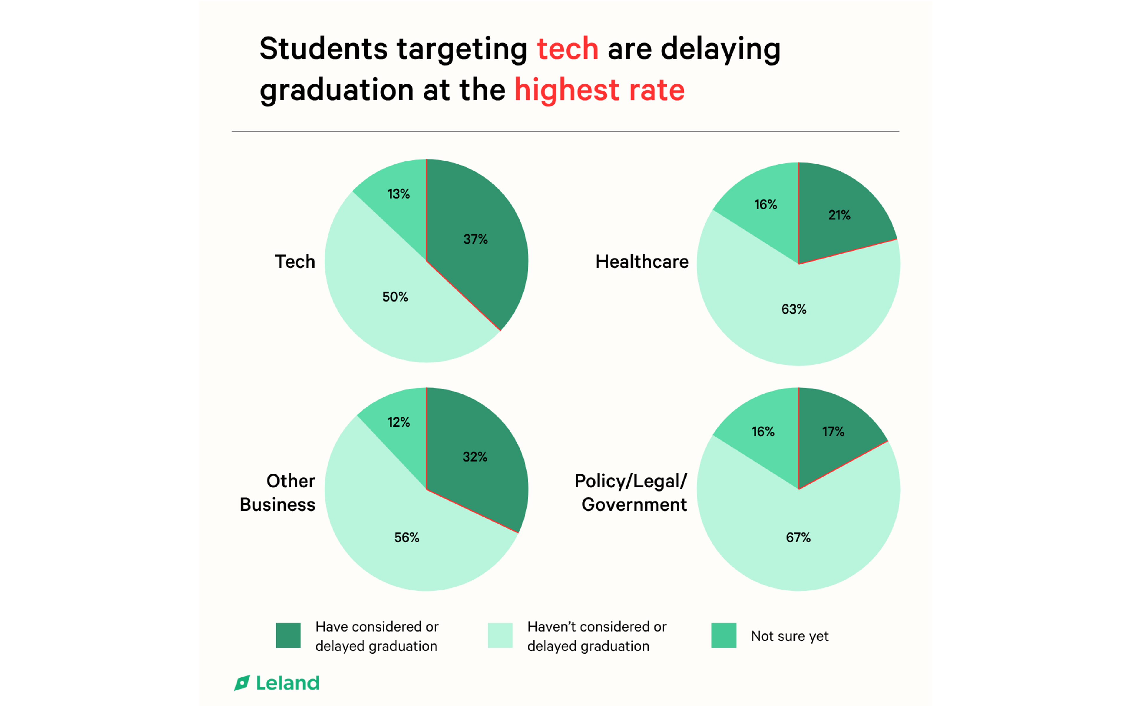 Men are more likely than women to postpone graduation, with 31% reporting they’ve considered or already delayed, compared to 26% of women. The trend also skews by industry: tech-bound students lead the way, with a striking 37% opting to delay, far higher than their peers in healthcare (21%), business (32%), and policy/government (17%).