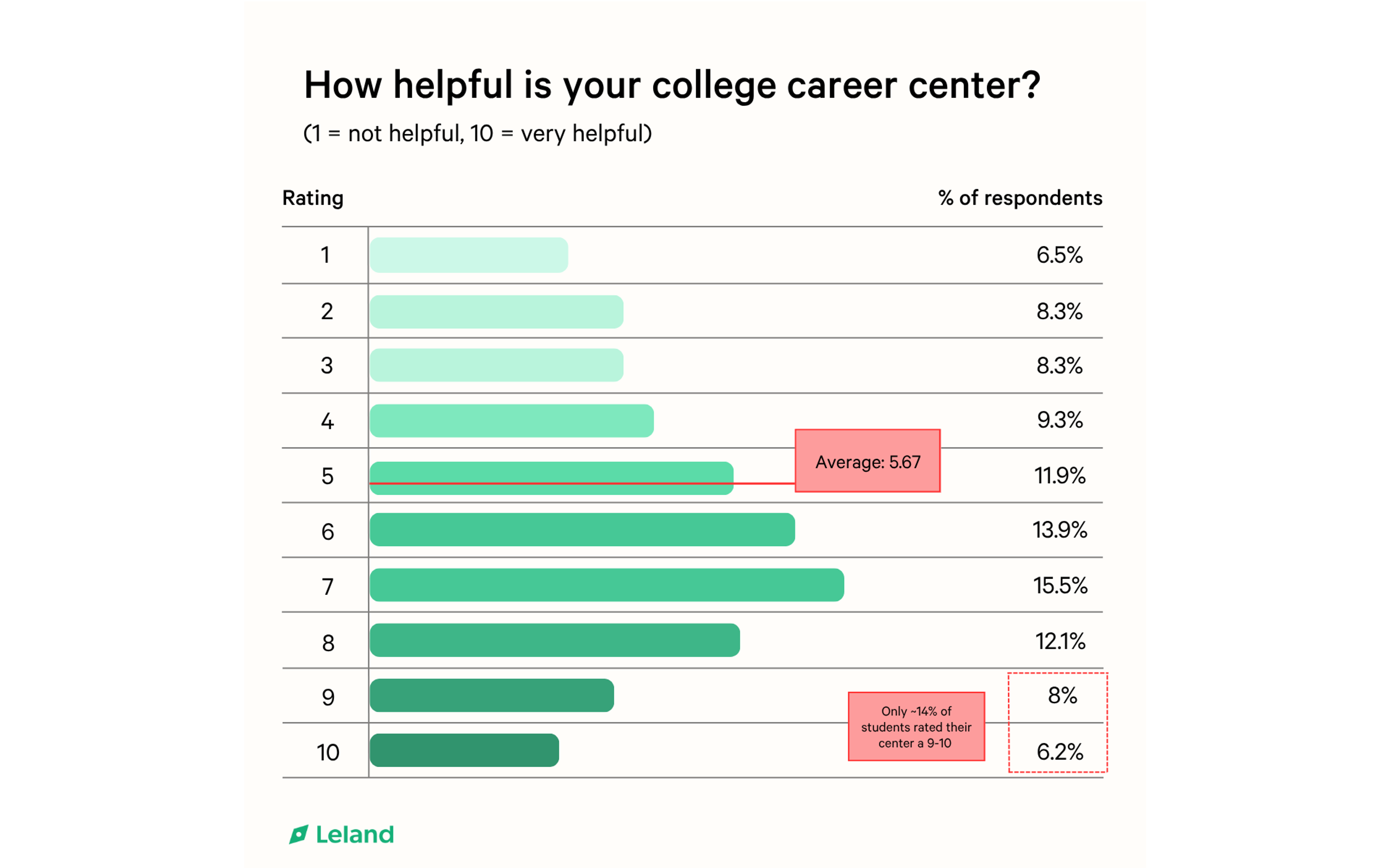 When asked to rate their career center’s helpfulness on a scale from 1 to 10, the average rating was just 5.67. That puts career services somewhere between “meh” and “mostly unhelpful.” In fact, fewer than 14% of students rated their center a 9 or 10. The most common rating? A tepid 7, followed closely by a shrugging 6 and an ambivalent 5.
