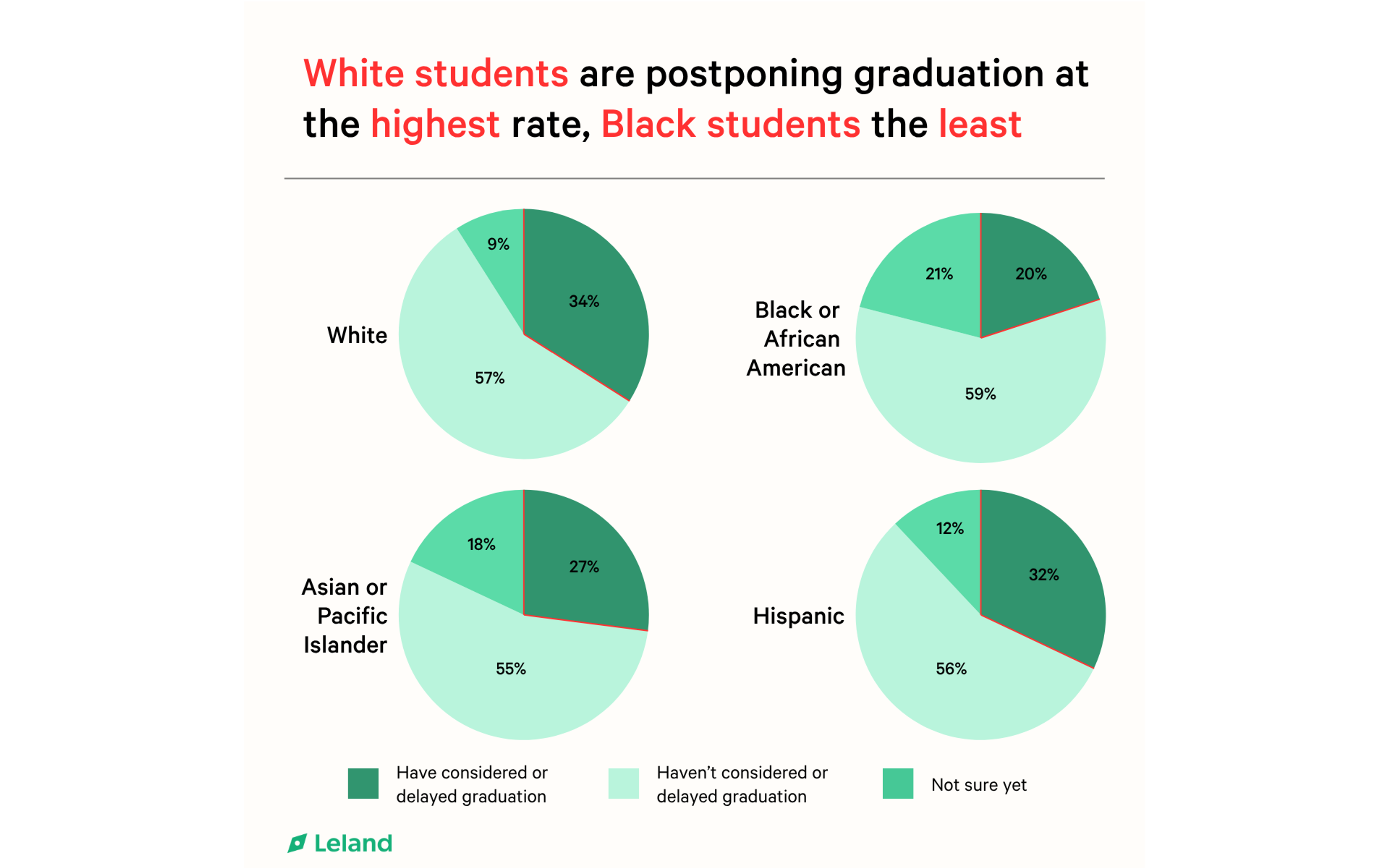 Race and ethnicity shape the story, too. White students report the highest rate of postponement (34%), while Black students are least likely to delay (20%). Hispanic and Asian students fall somewhere in the middle. These variations may reflect differences in financial flexibility, cultural expectations, or institutional support, but the net effect is the same: extra time, extra cost, and no guaranteed return.