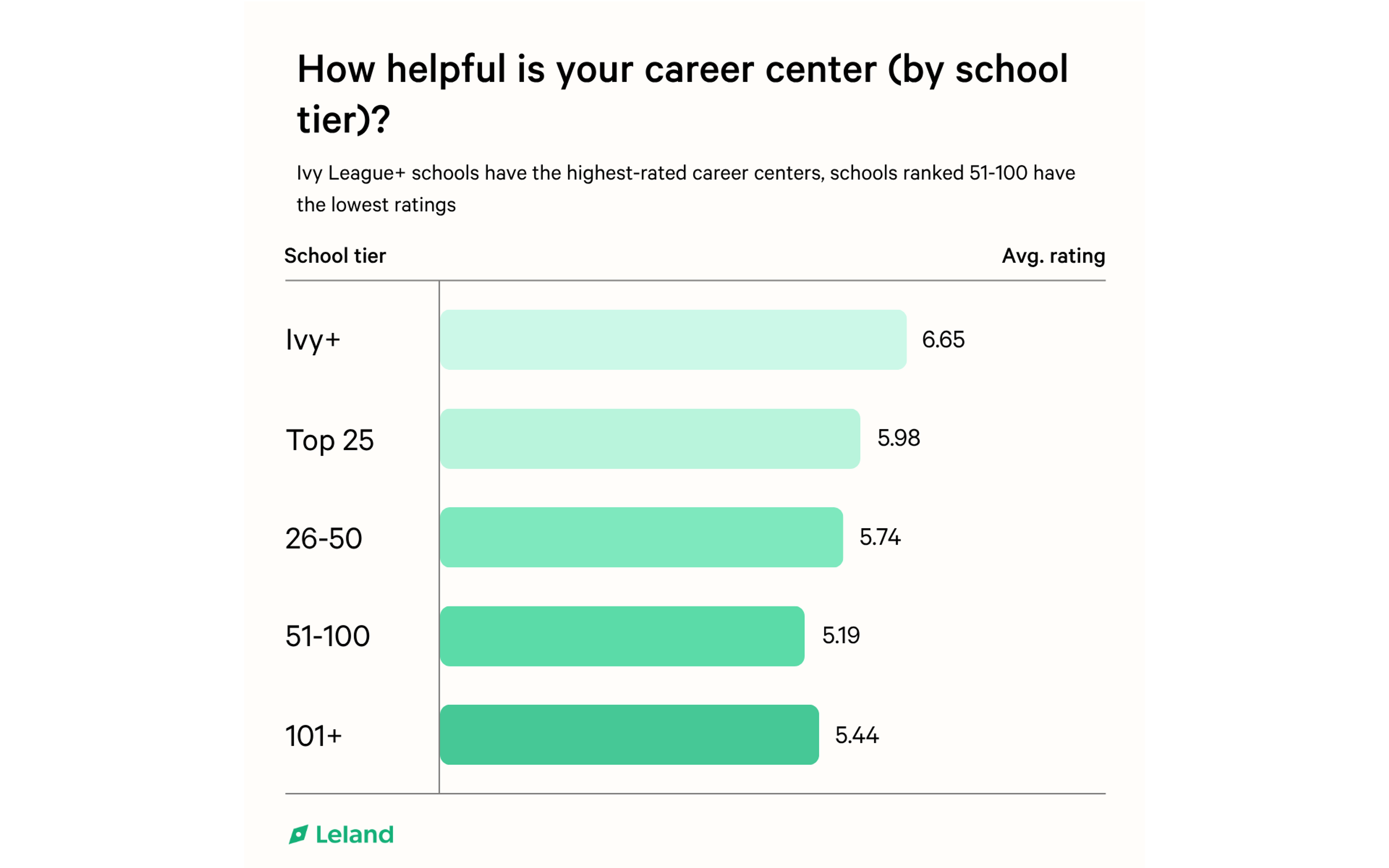 These aren’t isolated impressions, they’re systemic patterns. Students from lower-ranked schools consistently reported worse experiences. At Ivy+ institutions, the average career center rating was 6.65, but that number drops steadily as school ranking declines, hitting a low of 5.19 among students at schools ranked 51-100. Students at schools outside the top 100 fared slightly better (5.44), though still well below elite benchmarks. This is also likely affected by the brand name associated with top universities. Research from a non-profit, non-partisan arm of Harvard University found that students who attend these institutions are three times as likely to work at a prestigious firm and over two times as likely to get into an elite graduate school.