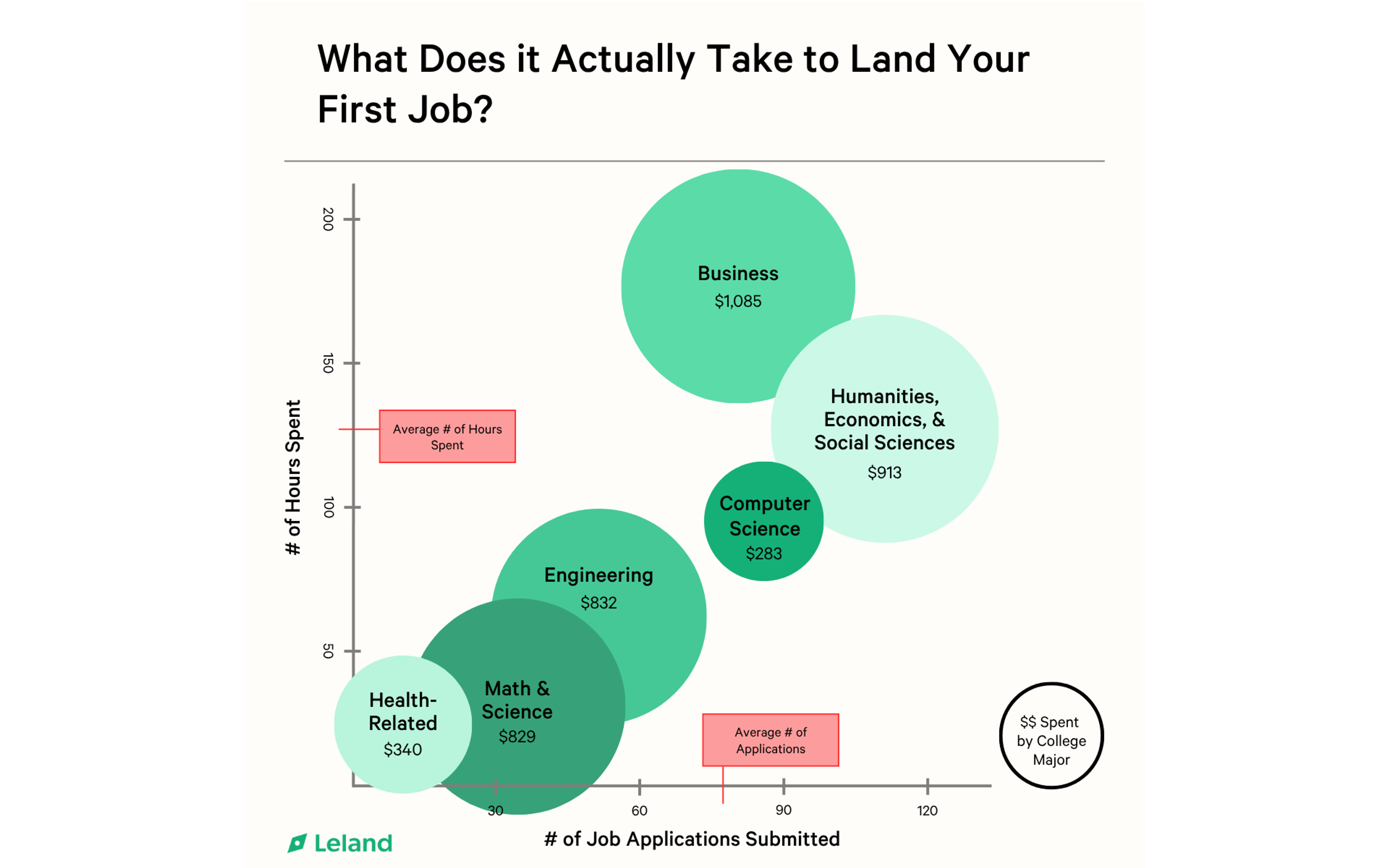 Engineering majors aren’t far behind in terms of time and effort. They spend 65 hours and apply to 54 jobs, all while shelling out $832 to land their first role.