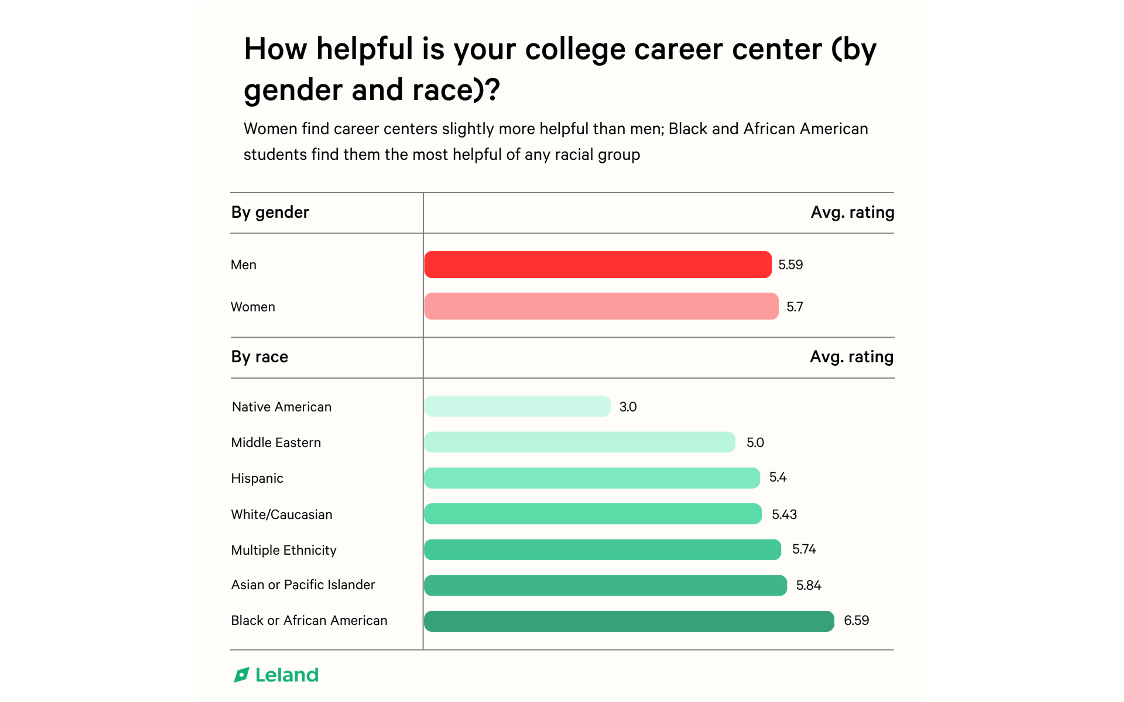 Gender gaps also emerged. Women rated their career centers slightly more favorably than men (5.7 vs. 5.59), but the difference was marginal, and neither group found them particularly helpful.