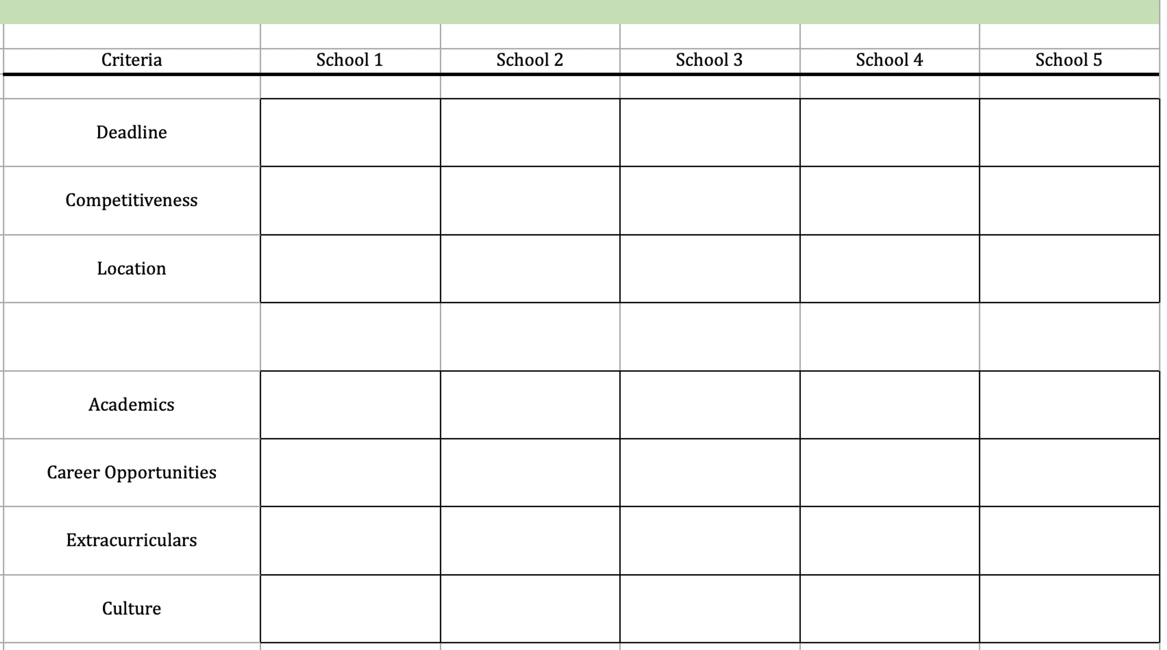 To help you keep track of all your criteria and all of your schools, we put together this helpful School Selection Spreadsheet. It has our recommended criteria pre-populated, so you can compare all of your prospective schools, but of course, feel free to make your own tweaks. To fill it out, simply enter in the relevant information from your research, so you have it handy in one place.